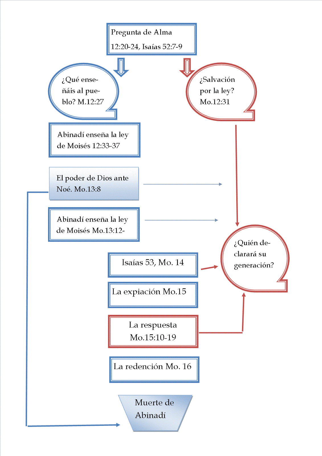 Con esta pregunta Abinadí conduce a quienes le escuchan a la ley de Moisés. Éste es el mensaje del Señor, el objetivo principal. Amonestar al rey y al pueblo a que obedezcan los mandamientos, capítulo 13 - A continuación hace una pregunta cerrada ¿Viene la salvación por la ley de Moisés? (12:31)