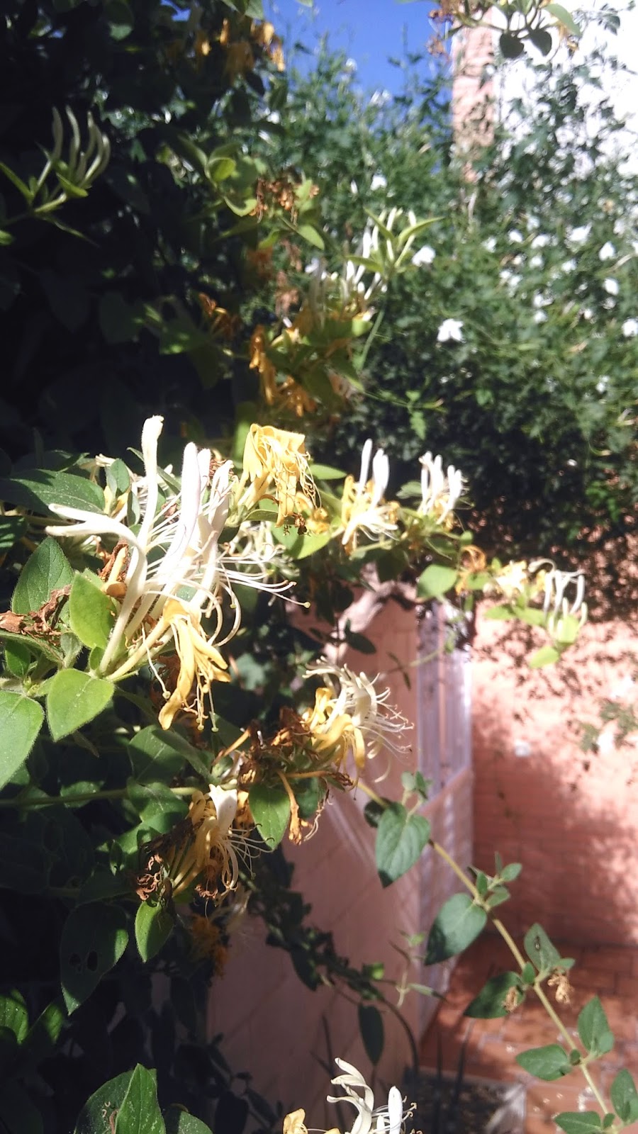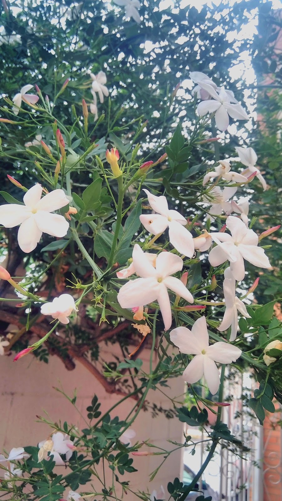 Nuestro jazminero creció fuerte y saludable en su aspecto. Pueden verlo en esta imagen, es el nuestro. Las primeras flores que dio fueron celebradas por Nati y por mí. Había que acercarse casi hasta tocarlas con la nariz para aspirar su perfume. Sin embargo ahora es un arbusto, frondoso, aun desde la calle, puedo percibir ese olor tan especial. En verano tengo que barrer diariamente la alfombra de flores en la entrada de la casa. Algunas las llevamos al dormitorio, me gusta dormir en ese ambiente.